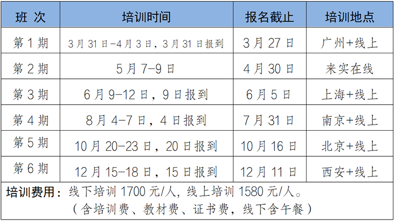 选择通过线上直播培训的学员,本人在年度内可免费参加1期相同课程线下班学习(交通食宿自理,线上班已收到教材和证书的学员,线下班不重复发放)。