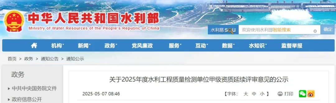 96家质检单位资质面临降级!水利部发布2025年甲级检测单位资质延续评审意见