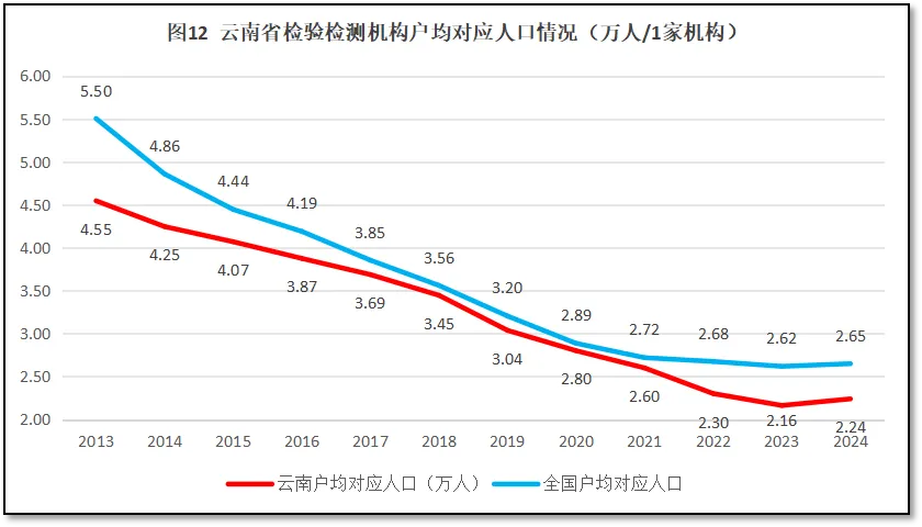 由图12可见,过去12年,云南省检验检测机构户均对应的人口数量逐年下降,但云南的数据一直低于全国平均数。云南省检验检测机构从2013年的户均对应4.55万人,下降到2024年的2.24万人左右。从人口数量的对比值来看,云南省检验检测机构数量显得很多,从检验检测机构户均对应当地GDP值来看,也显得多了一点。这说明云南省经济状况一般,人口也不多,但检验检测行业发展过热,已经超出了云南省经济建设和社会发展的正常需求。