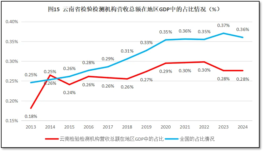 从图15可见,除了2014年之外,过去10年云南省检验检测机构营收总额在当地GDP中的占比增长不大,2021-2022年占比达到0.3%的高点后,2023年又下降到了0.28%,2024年维持在8%。除了2014年之外,云南省的数值一直比全国平均数要低,且近几年还有被全国平均数拉开差距的迹象。这说明云南省检验检测机构在云南省经济版图中的地位不高,其创造的价值与云南省的经济总量相比还很微小,最近几年这种情况还有所恶化。