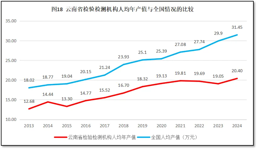 云南省检验检测机构人均年产值与全国的情况比较,如图18所示。