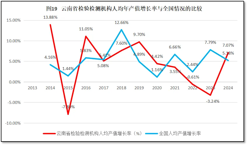 再来看云南省检验检测机构人均年产值增长率与全国人均年产值增长率的比较,如图19所示。