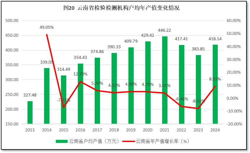 由图20可见,在2021年之前,云南省检验检测机构户均年产值总体保持增长,但2021年之后开始下降,2024年才止跌回升,户均年产值为418.14万元,是2013年的1.84倍。从增长率的曲线来看,除了头两年数据误差大显得增长率很高之外,从2015年到2021年,云南省检验检测机构户均年产值的年均增幅为4.14%,增长较为平稳。但到了2022年和2023年均降为负值,说明这两年云南省检验检测机构的经营比较困难。2024年云南省检验检测机构户均年产值增长率反弹较大,增长率达到8.93%。