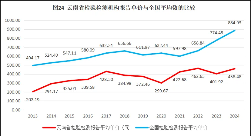 由图24可见,云南省检验检测报告的单价总体保持增长,但增长十分缓慢,且一直比全国平均水平要低,最近两年年还有被全国平均水平拉开距离的趋势。2024年云南省检验检测机构报告单价458.48元,在全国排名垫底,与全国平均数884.93元低了426.45元。可见,云南省检验检测机构不仅对外出具的检验检测报告数量少,其报告单价也低,说明其利润空间小,检验检测机构之间的价格战非常惨烈,可能隐藏着很大的虚假检验检测风险。