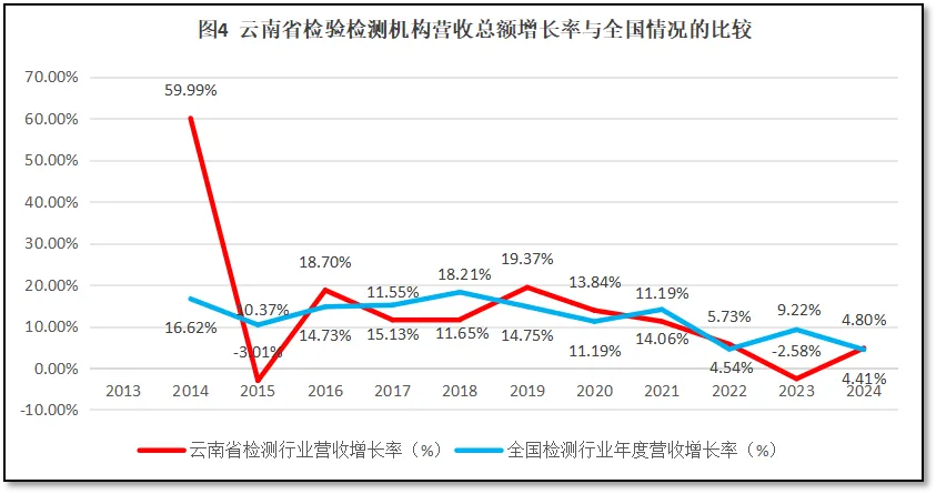 比较云南省检验检测行业年度营收总额增长率与全国检验检测行业年度营收总额增长率随时间的变化,如图4所示。