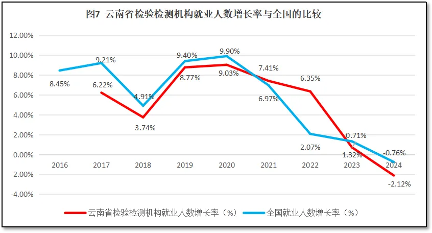 云南省检验检测机构就业人数增长率与全国检验检测机构就业人数增长率的比较,如图7所示。