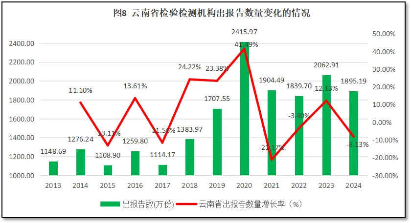 过去12年云南省检验检测机构对外出具检验检测报告的数量,如图8所示。